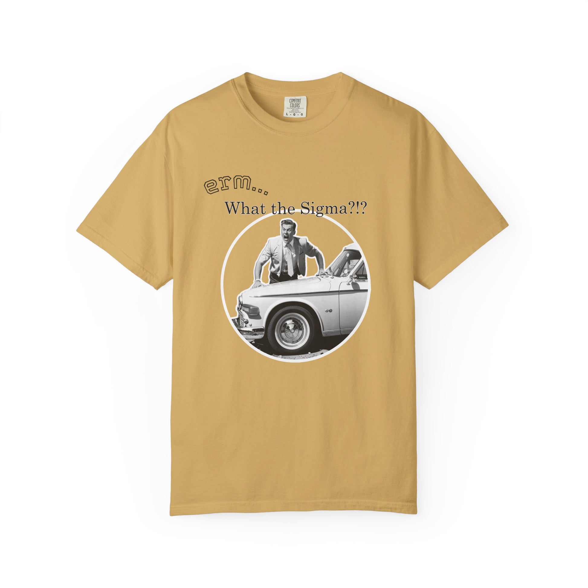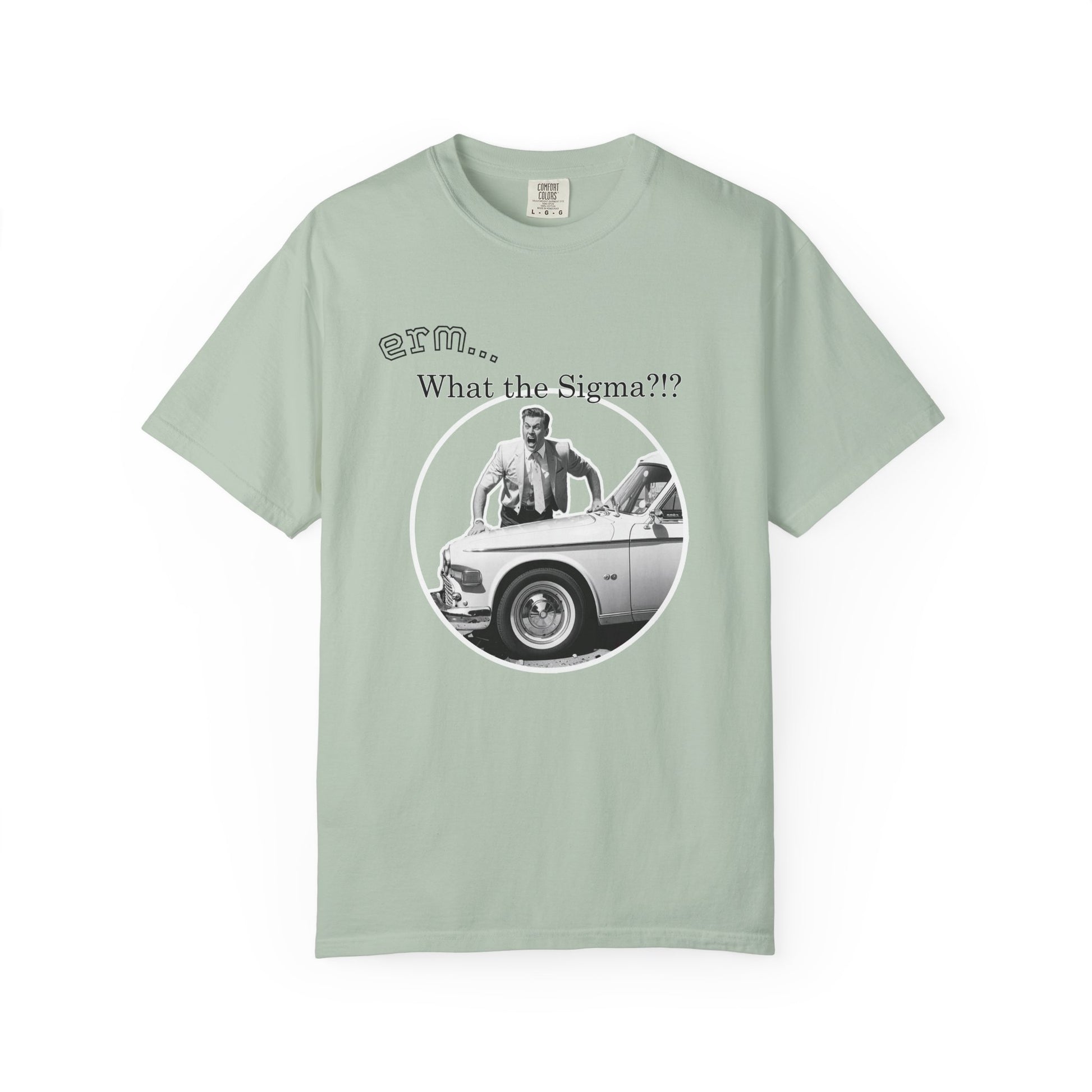 Vintage-inspired unisex garment-dyed T-shirt featuring a 1950's style design of a man yelling 'what the sigma', a mix of old style advertisement with Gen Alpha slang. The tee exudes a retro yet contemporary vibe, perfect for those who appreciate a blend of past and present in their wardrobe. Ideal for individuals who enjoy unique and quirky graphic tees this tee is great for fans of vintage styles and pop culture references, suitable for everyday wear or as a statement piece during events and gatherings.